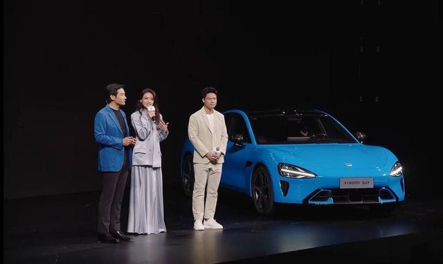 在发布会上,雷军、舒淇、苏炳添站在新款小米SU7旁边;图源:小米发布会